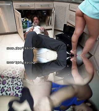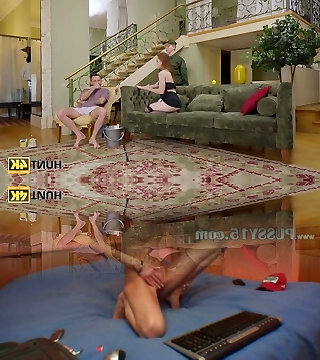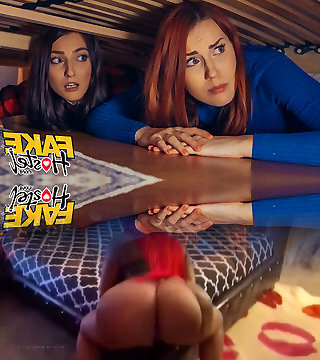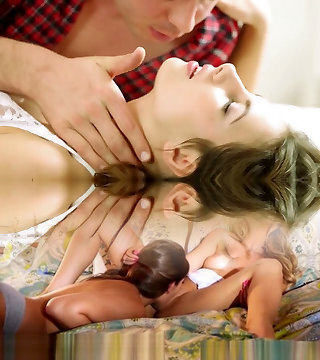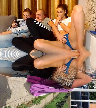 Hot brunette in panties teasing sisters beau on couch