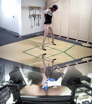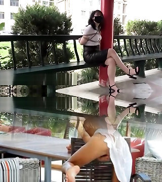 Babe in miniskirt and high high-heeled slippers Nora Riley tied up and tortured