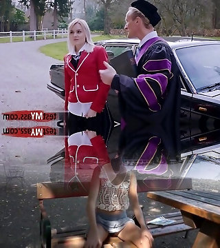 Blonde with green tie gets fucked by 2 cocks
