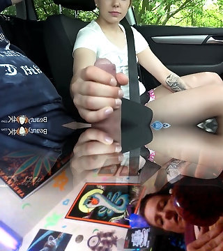 nymphe folle, lily adams est en train de sucer la bite dans la voiture et de la caresser pour la faire vomir