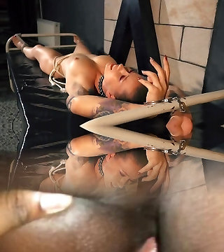 la mariée brune mince soumise se fait menotter, gorge profonde et baisée durement par son fiancé encré dur