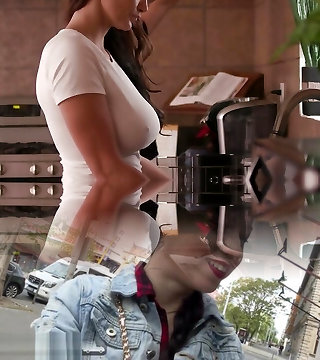 couguar époustouflant avec de faux seins donnant à son petit ami des coups de seins dans un tournage en pov
