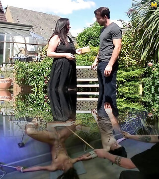 jade, femme au foyer mature et aux gros seins, s'assoit confortablement dans les escaliers et les valets
