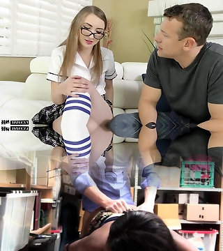 Nerdy schoolgirl with glasses takes fat man meat in good-sized ass on table (Roxanne Rae)