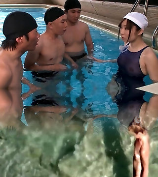 Beautiful Swimsuit Clad Japanese Group-fucked by Three Stiffys by the Pool