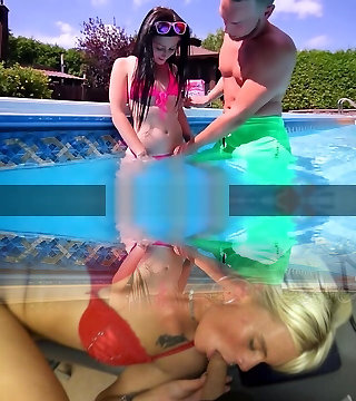 Three lesbos at the pool are licking rump and licking pussy