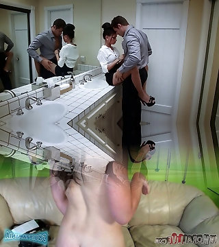 Mouth-watering brunette in high heels swallows cum after pounded in the restroom