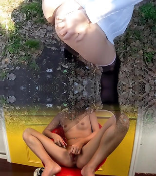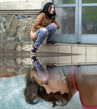 Seductive dark haired girl makes piss outdoors during rainy day